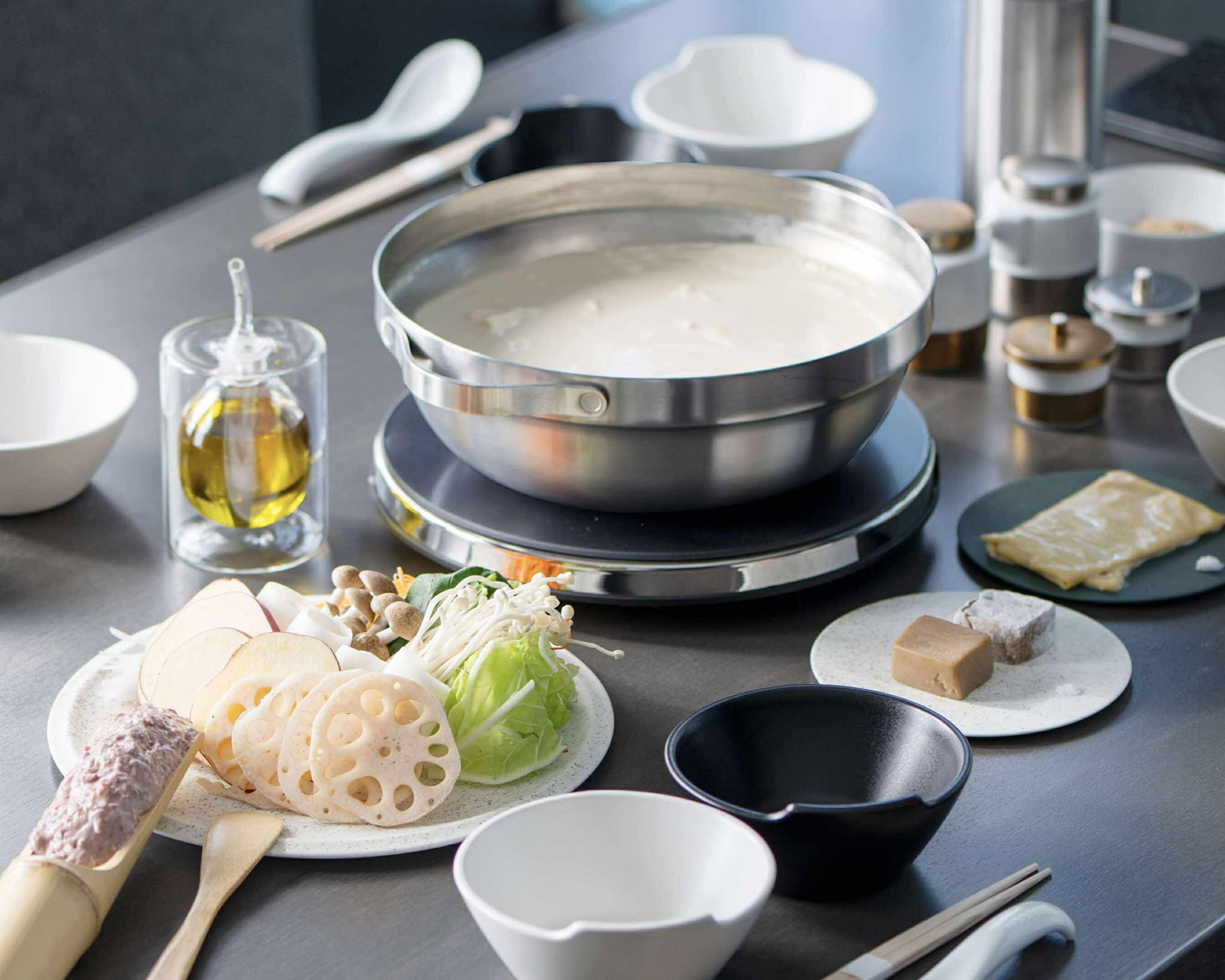 和多屋別荘店では、ビーガン対応のために開発された100%植物性のたれを使用し平川屋の他店舗では味わえない温泉湯⾖腐を主体にした⾖腐のコース料理のほか、カフェメニューには和多屋別荘店限定の豆乳パフェ(抹茶金時)をご用意しております。